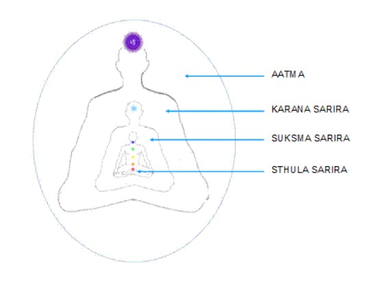 | KARANA SARIRA | = Oorzakelijk lichaam (hogere gevoelens, ego, intellect, geheugen) |